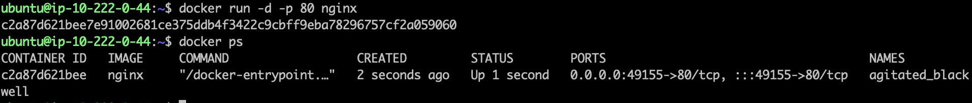 두 번째로 docker run -d -p 80 nginx 명령어로 컨테이너 포트만 지정하면 호스트 IP의 49155포트로 연결된 걸 볼 수 있다.