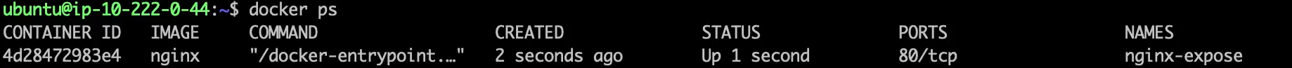 expose 명령어를 이용해서 컨테이너를 실행시켜보면 80번 포트만 적혀있고 맵핑됐다는 화살표 표시가 없다.