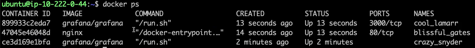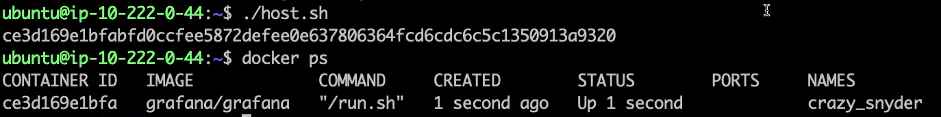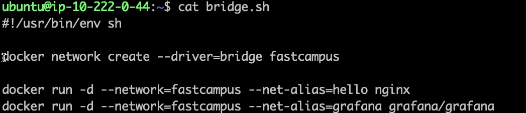 bridge.sh 스크립트를 실행하면 새 브릿지가 생성된 걸 볼 수 있고 "nginx"와 "grafana/grafana" 라는 컨테이너가 생성된 걸 볼 수 있다.