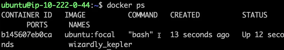 그리고 다른 터미널로 docker ps 명령어를 입력하면 bash 커맨드로 컨테이너가 실행 중인걸 볼 수 있다.