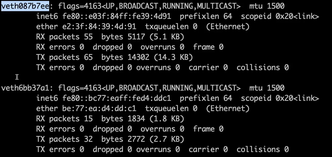 호스트에서 ifconfig 명령어를 입력하면 컨테이너 갯수만큼 veth가 생성됐고 ens5라는 호스트의 eth도 볼 수 있다.