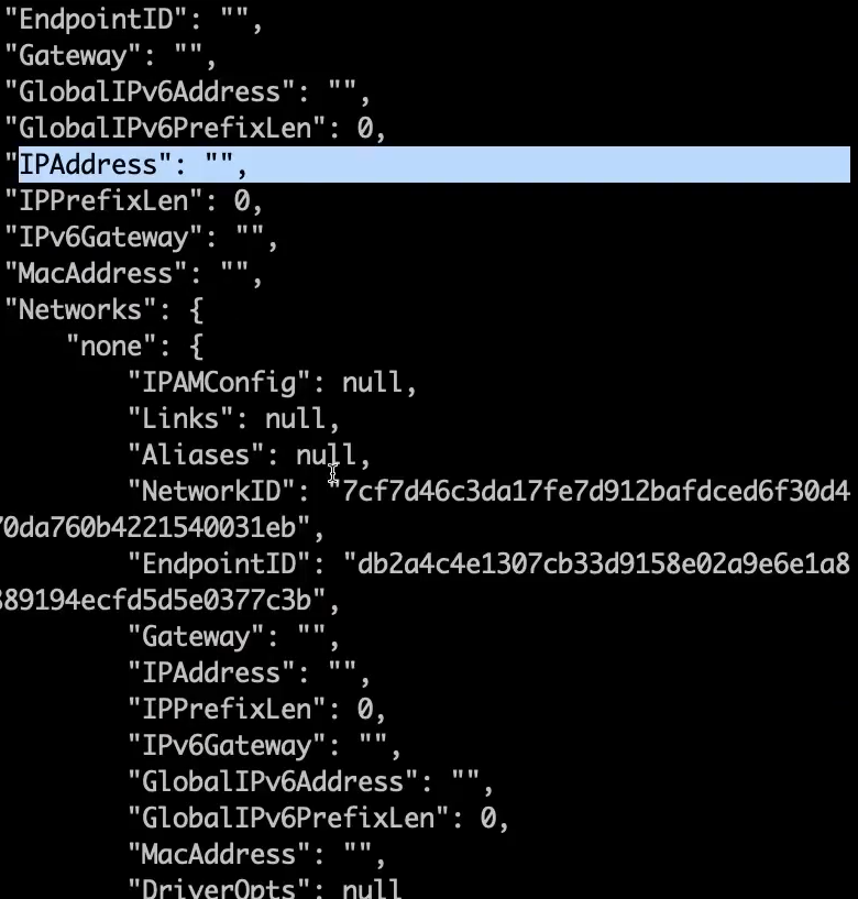 inspect 명령어로 확인해보면 브릿지, 드라이버, ip주소, mac주소 등등이 none 상태인 걸 볼 수 있다.