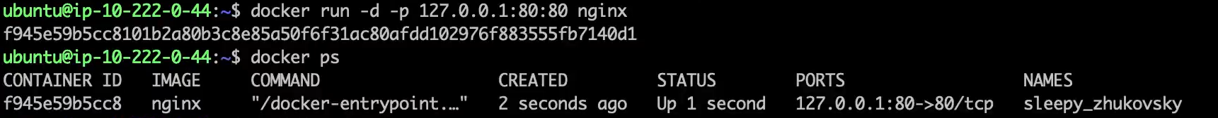 세 번째는 docker run -d -p 127.0.0.1:80:80 nginx 명령어로 ec2 인스턴스의 private ip나 public ip가 아닌 로컬 호스트의 80번 포트와 컨테이너의 80번 포트를 맵핑했다.