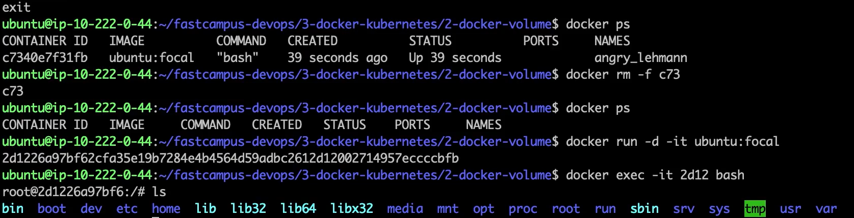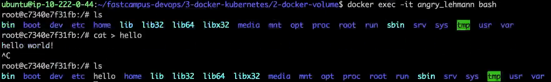 그리고 docker rm 명령어로 컨테이너를 삭제한 후 다시 컨테이너를 만들면 그 컨테이너에는 hello라는 파일이 존재하지 않는다.