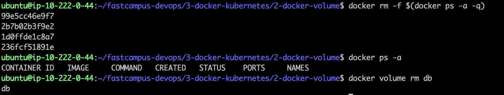 실행중인 컨테이너를 모두 삭제한 후 볼륨도 삭제했다.