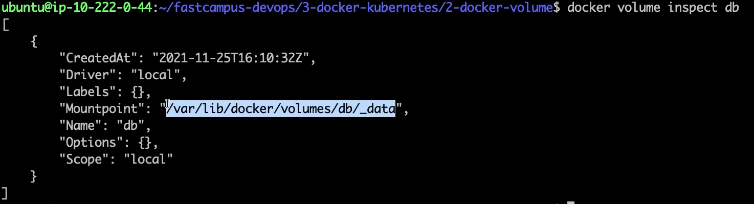 docker volume inspect db 명령어로 mountpoint를 확인할 수 있다.