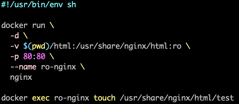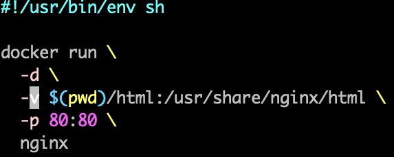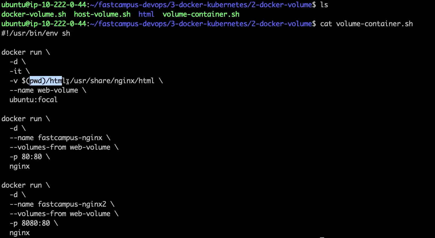 host-volume.sh 를 보면 -v 옵션을 통해 호스트와 컨테이너의 볼륨 경로를 적는다. pwd는 현재 디렉토리 경로를 출력한다.