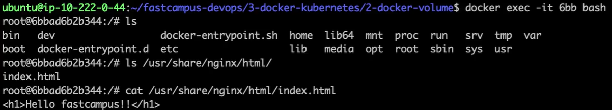 docker exec 명령어로 nginx 컨테이너로 접속하면 index.html이 있는 걸 확인할 수 있다.