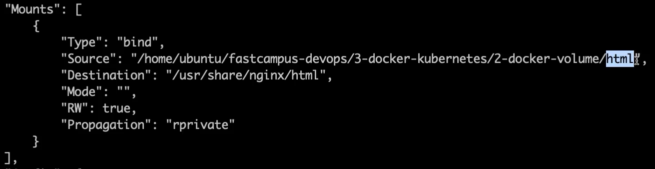docker inspect fastcampus-nginx 명령어로 볼륨 마운트 정보를 확인해보자