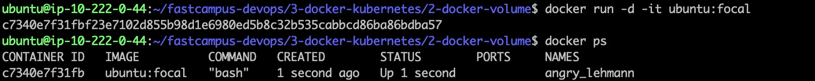 docker run -d -it ubuntu:focal 명령어로 컨테이너를 실행한다.