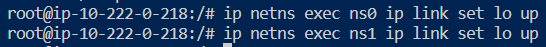 4. ip netns exec [ns0 | ns1] ip link set lo up 명령어로 ns0와 ns1의 인터페이스를 모두 구동하도록 세팅한다.