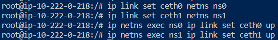 ip netns exec [ns0 | ns1] ip link set [ceth0 | ceth1] up 명령어로 ceth*를 시작한다.