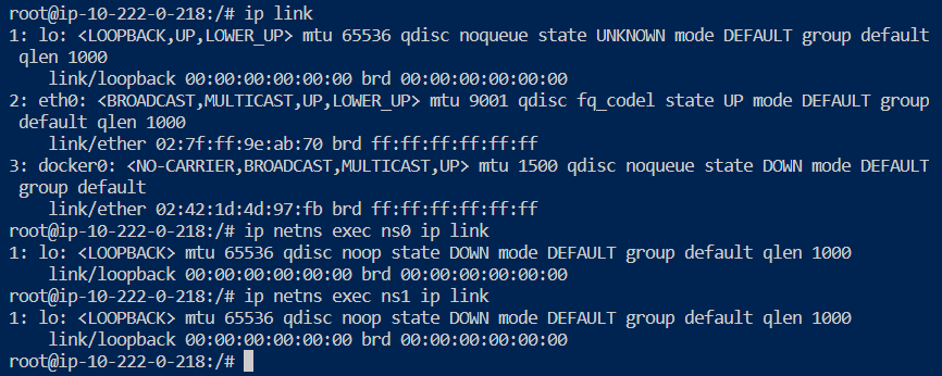 ns0와 ns1의 인터페이스 정보를 보고 싶다면 ip netns exec ns0 ip link 명령어와 ip netns exec ns1 ip link 명령어를