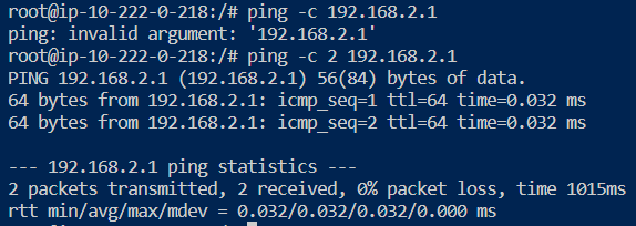 8. ping -c 2 192.168.2.1 명령어로 핑을 두번 날려본다.