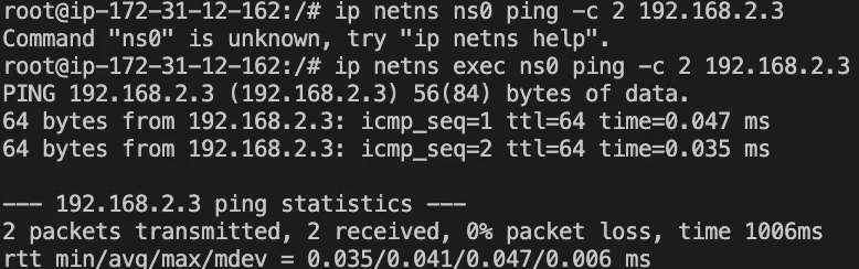 13. ip netns exec ns0 ping -c 2 192.168.2.3 명령어로 ns0에서 ns1로 연결한다.