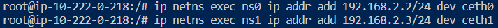12. ip netns exec [ns0 | ns1] ip addr add 192.168.2.2/24 dev [ceth0 | ceth1] 명령어로