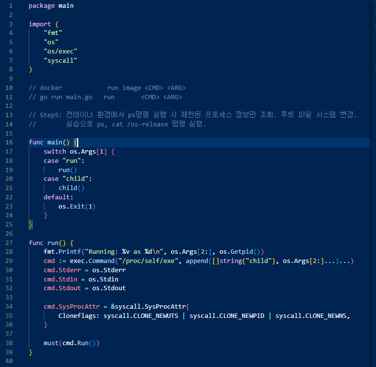 go run . run /bin/bash 명령어로 실행해보면 잘 동작한다.