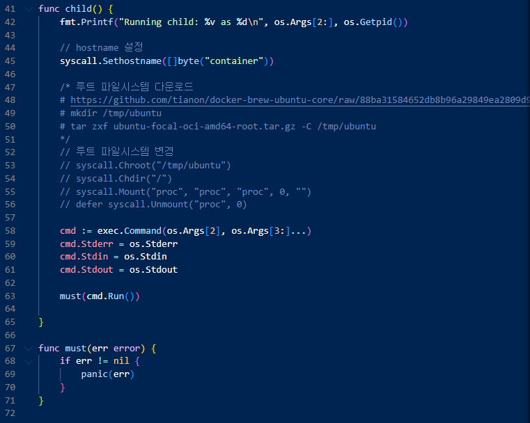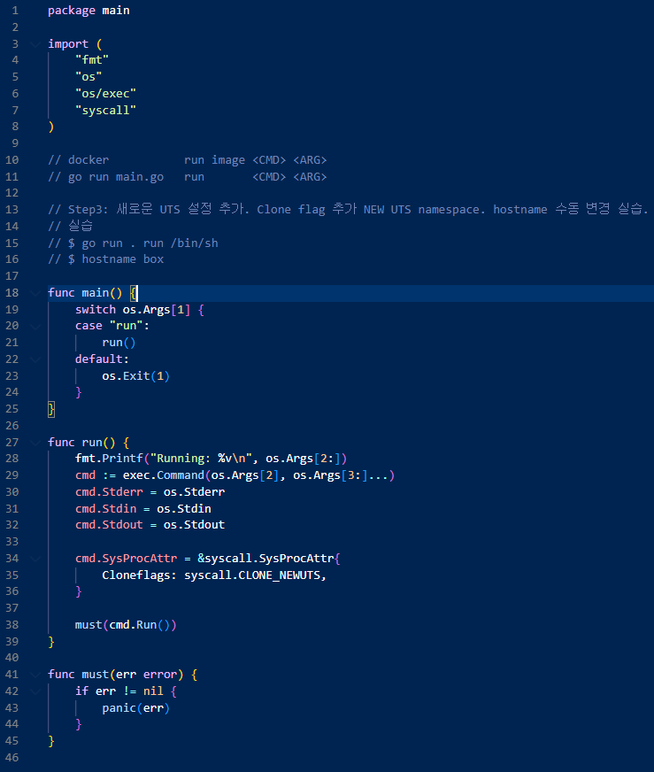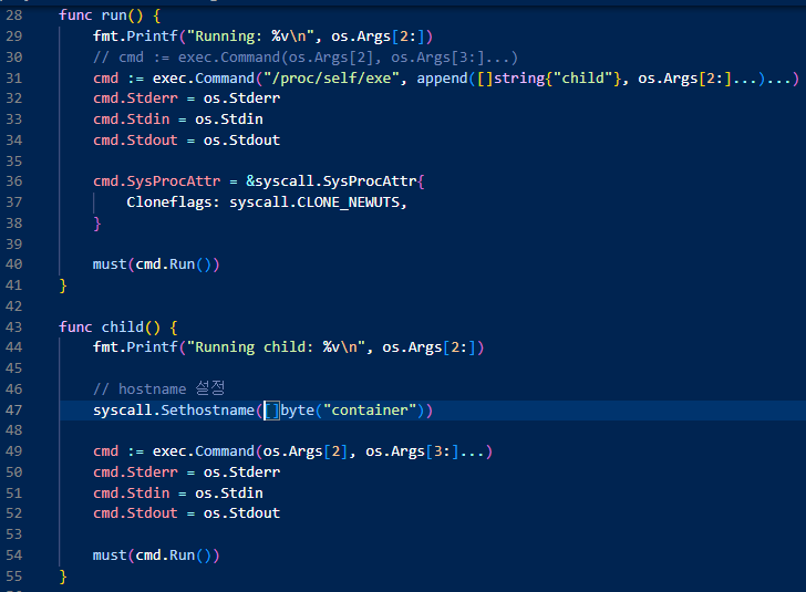 child() 함수에서는 기존 3단계의 run()함수와 동일한 기능을 하고 부모에서 파생되었기 때문에 hostname을 변경하는 Sethostname이라는 함수를 시스템콜로 호출했다.