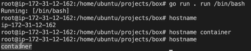 go run . run /bin/bash 명령어를 통해 bash 쉘을 열어보면 잘 동작하는걸 확인할 수 있다.