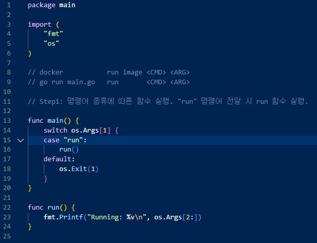 해당 코드를 보면 switch문에 os.Args[1]로 go 명령어 중 두 번째 단어가 run이면