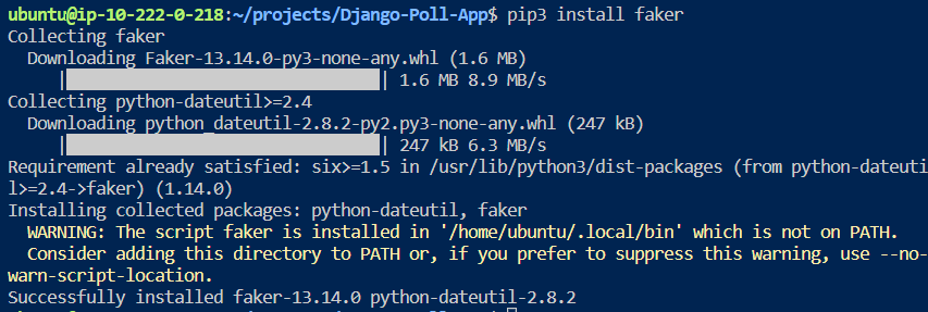 7. 더미 데이터를 생성하기 위해 pip3 install faker 명령어로 faker라는 툴을 다운로드 받고