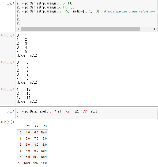 DataFrame 생성시, Series 간에 Index 기준으로 자동정렬이 된다.