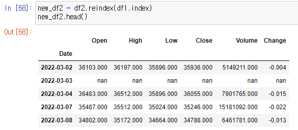 df1의 인덱스를 기준으로 new_df2을 reindex함수를 이용해서 생성하기