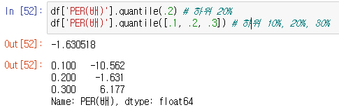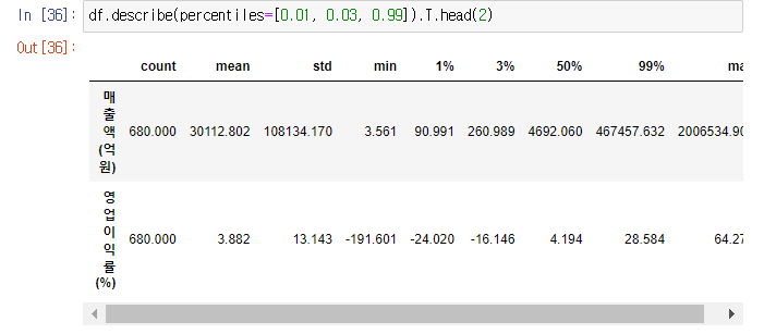 아래 조건은 매출액이 하위 1%, 하위 3%, 하위 99%이다.