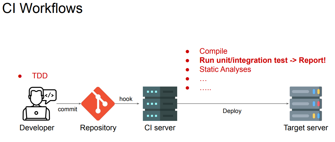 CI 서버에서는 그 이벤트를 받아서 소스코드를 컴파일, 유닛/통합 테스트, 정적분석 등 다양한 과정들을 거치고