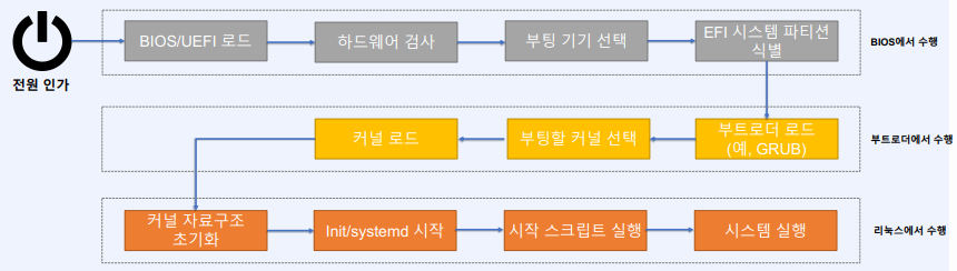 - BIOS(Basic Input/Output System) 에서 하드웨어 검사 후 부팅 기기 선택 및 파티션 식별