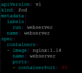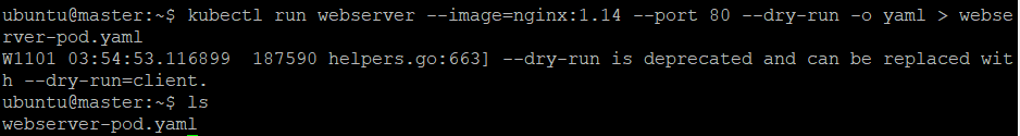 ex) kubectl run webserver --image=nginx:1.14 --port 80 --dry-run -o yaml > webserver-pod.yaml
