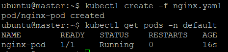 kubectl create -f nginx.yaml 명령어로 pod를 실행시키고 kubectl get pods -n default로 확인 가능하다.