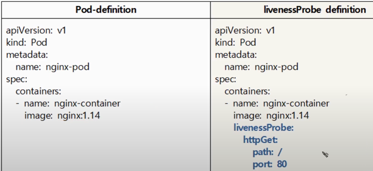 tcpSocker : 지정된 포트에 TCP연결을 시도, 연결되지 않으면 컨테이너 다시 시작한다.