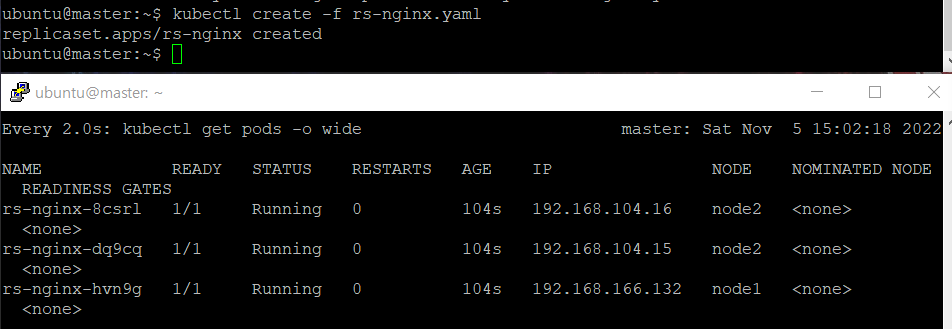 kubectl create -f rs-nginx.yaml로 실행하면 3개의 pod가 생성된다.
