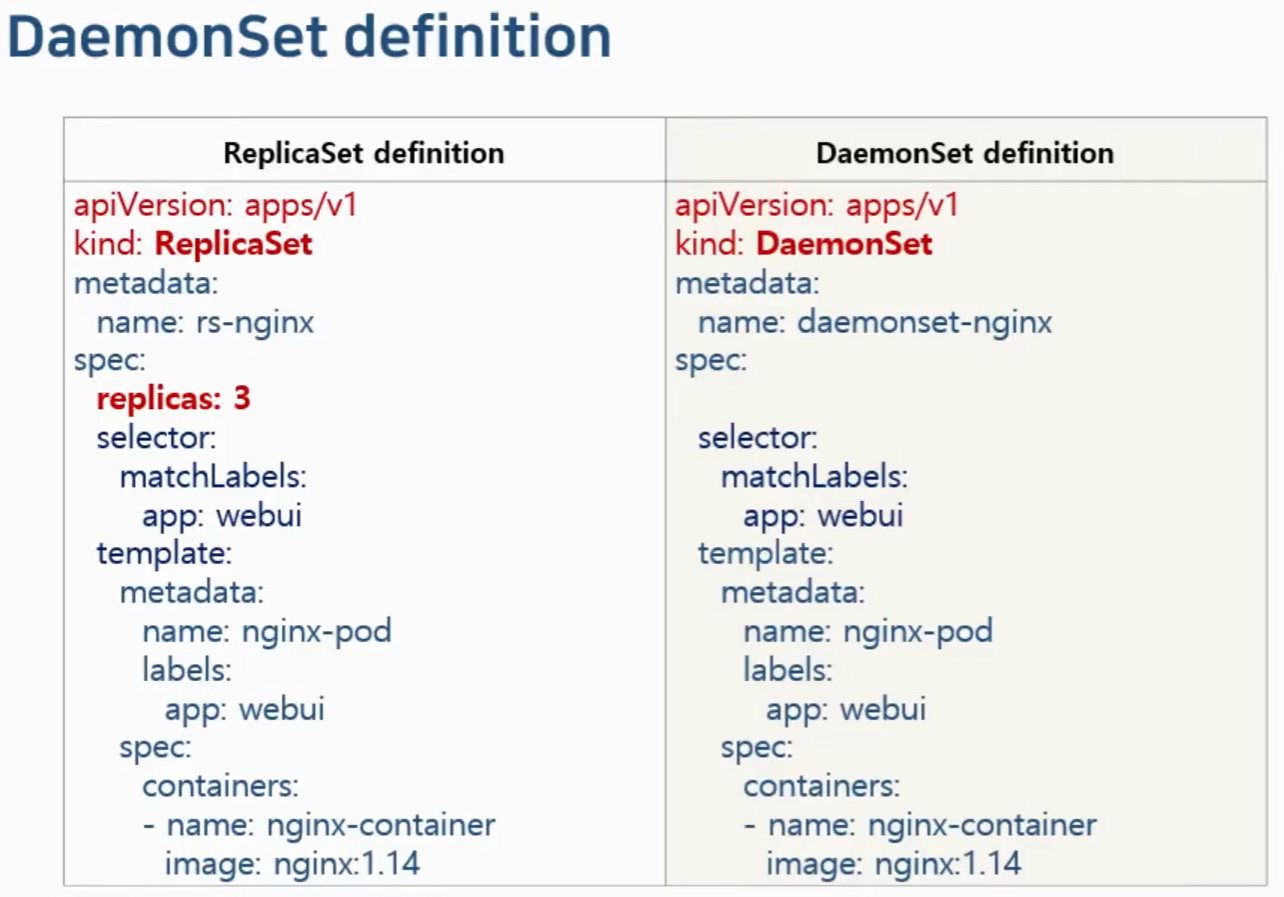 - 따로 레플리카스 지정할 필요없이 자동으로 노드당 1개 파드 보장한다.