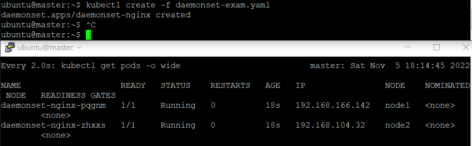 kubectl create -f daemonset-exam.yaml 로 데몬셋을 실행하면 node1과 node2에 파드가 하나씩 생성된다.
