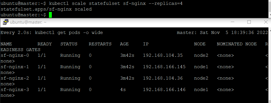 kubectl scale statefulset sf-nginx --replicas=4을 통해 scaleout해보면 sf-nginx-3 이라는 이름의 pod가 생성된다.