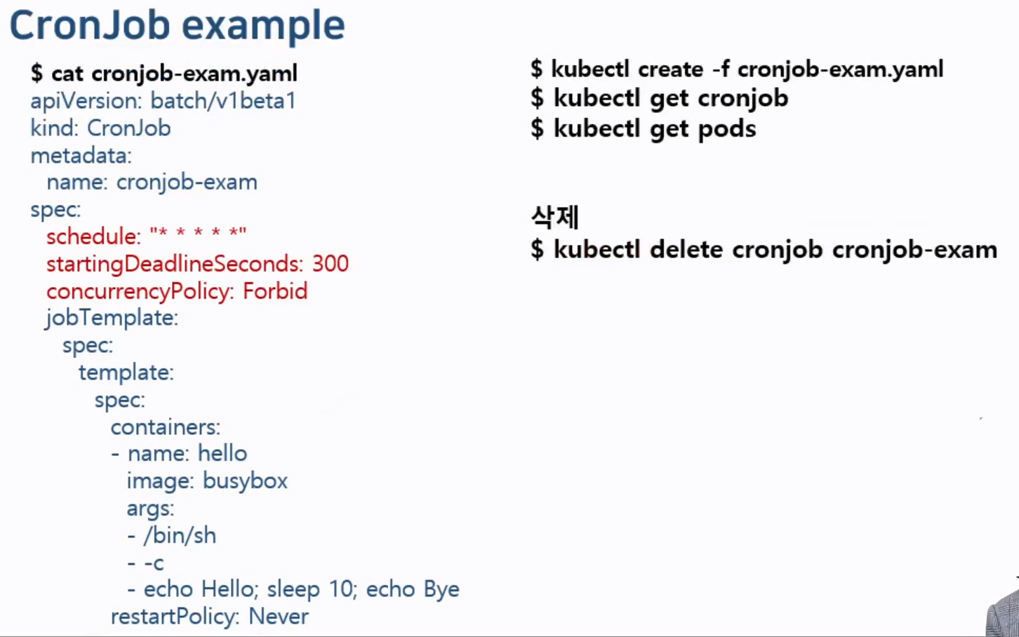 kubectl delete cronjob cronjob-exam을 통해 cronjob을 삭제할 수 있다.