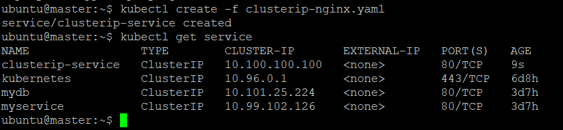 kubectl create -f clusterip-nginx.yaml로 클러스터ip를 파드에 연결시킨다.