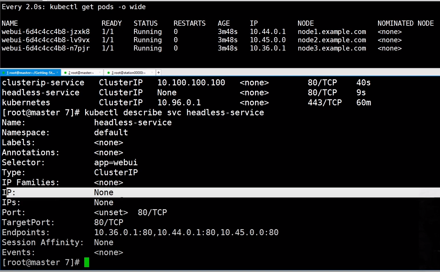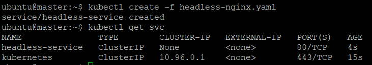 그리고 kubectl create -f headless-nginx.yaml로 실행하면 headless-service의 클러스터ip는 node인걸 확인할 수 있다.