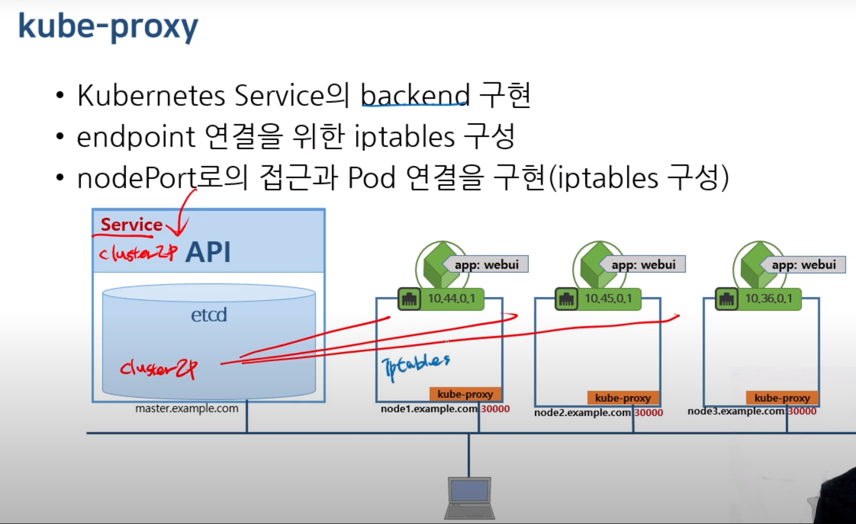 kube-proxy는 iptables rule을 만들고 관리하고 port 접속을 listen한다.