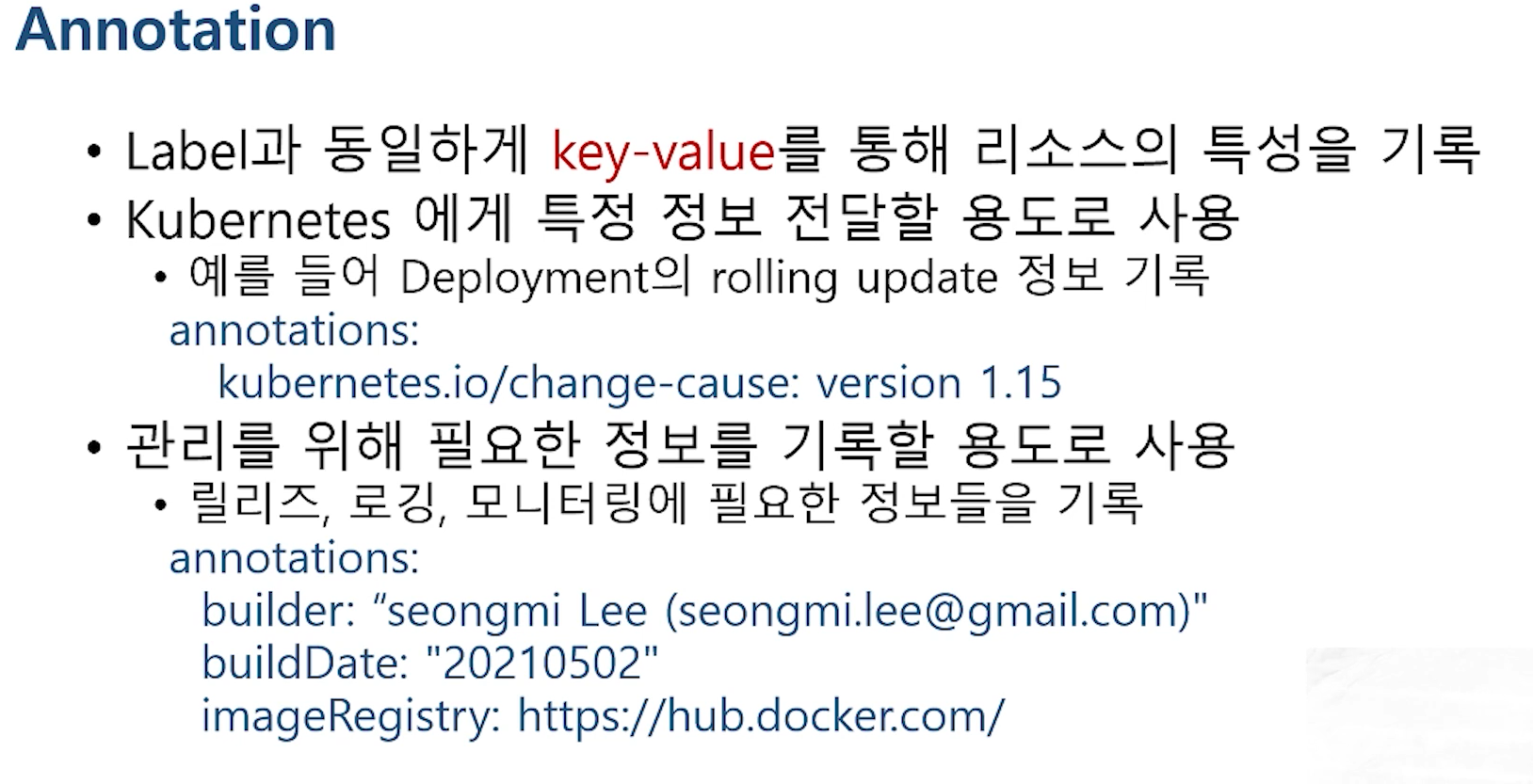 애노테이션은 쿠버네티스에게 특정 정보를 전달하기도 하고 필요한 정보를 기록할 용도로 사용된다.
