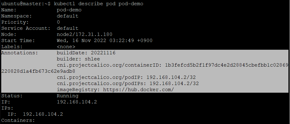 그리고 kubectl describe pod pod-demo 를 입력하면 우리가 입력한 애노테이션 정보를 볼 수 있다.
