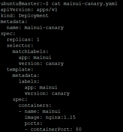 이번에는 카나리 버전으로 업데이트하기 위한 카나리 버전 파드의 파일인 mainui-canary.yaml을 보자