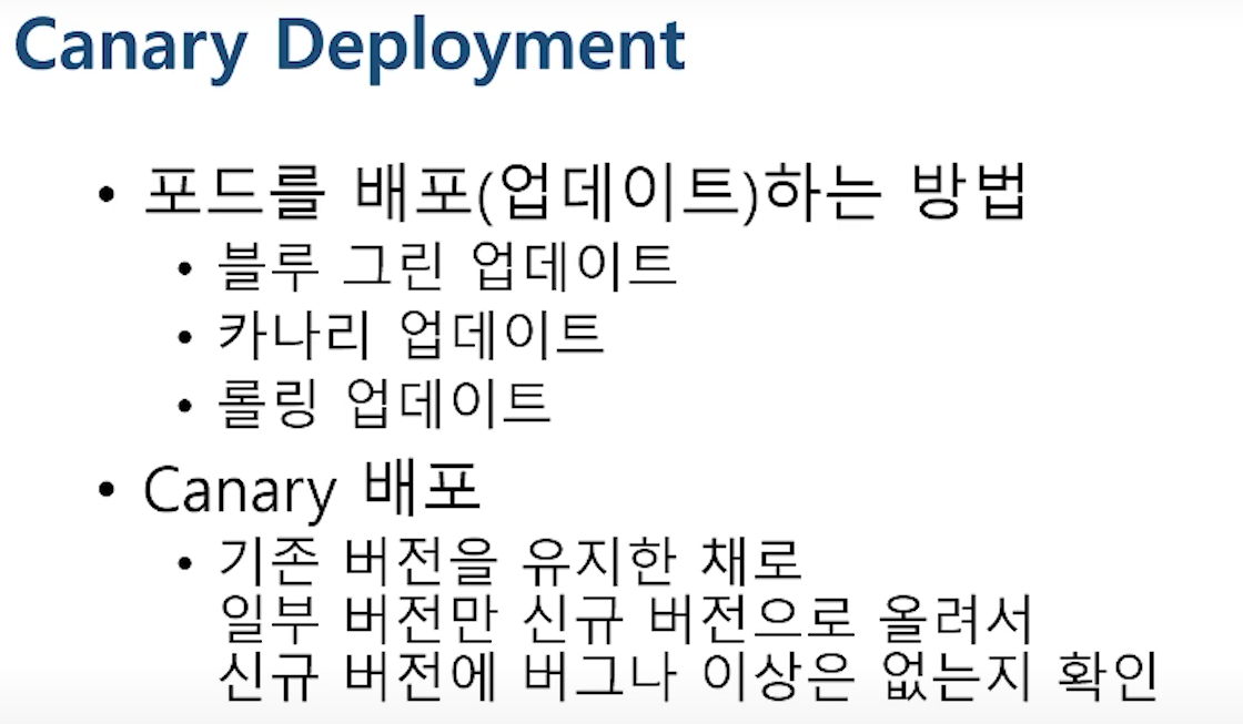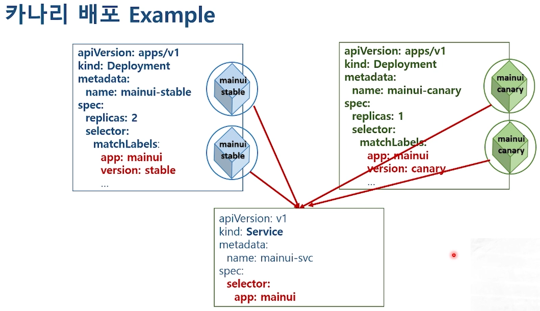카나리 업데이트 - 올드 버전 사이에 뉴 버전 하나 넣어서 모니터링하면서 배포하는 방법