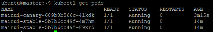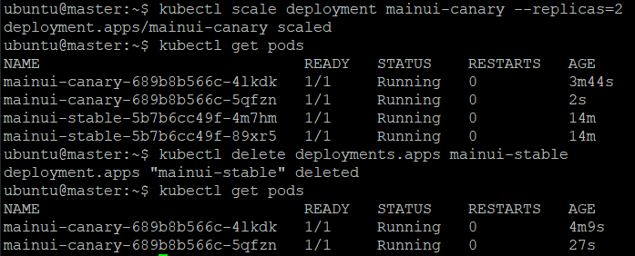 kubectl scale deployment mainui-canary --replicas=2 로 카나리 버전을 2개로 늘리고