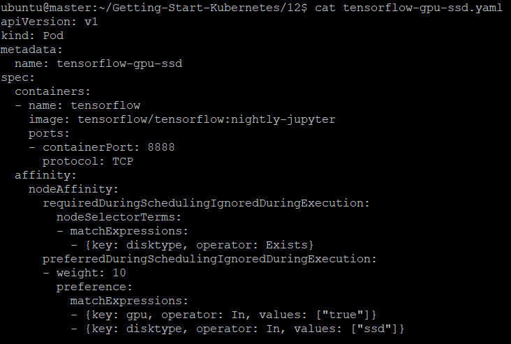 preferredDuringSchedulingIgnoredDuringExecution에는 레이블의 key가 gpu에 true값을 가지고 또한 key가 disktype에 ssd 값을 가지는 노드에 가중치를 10을 누적시키도록 하였다.