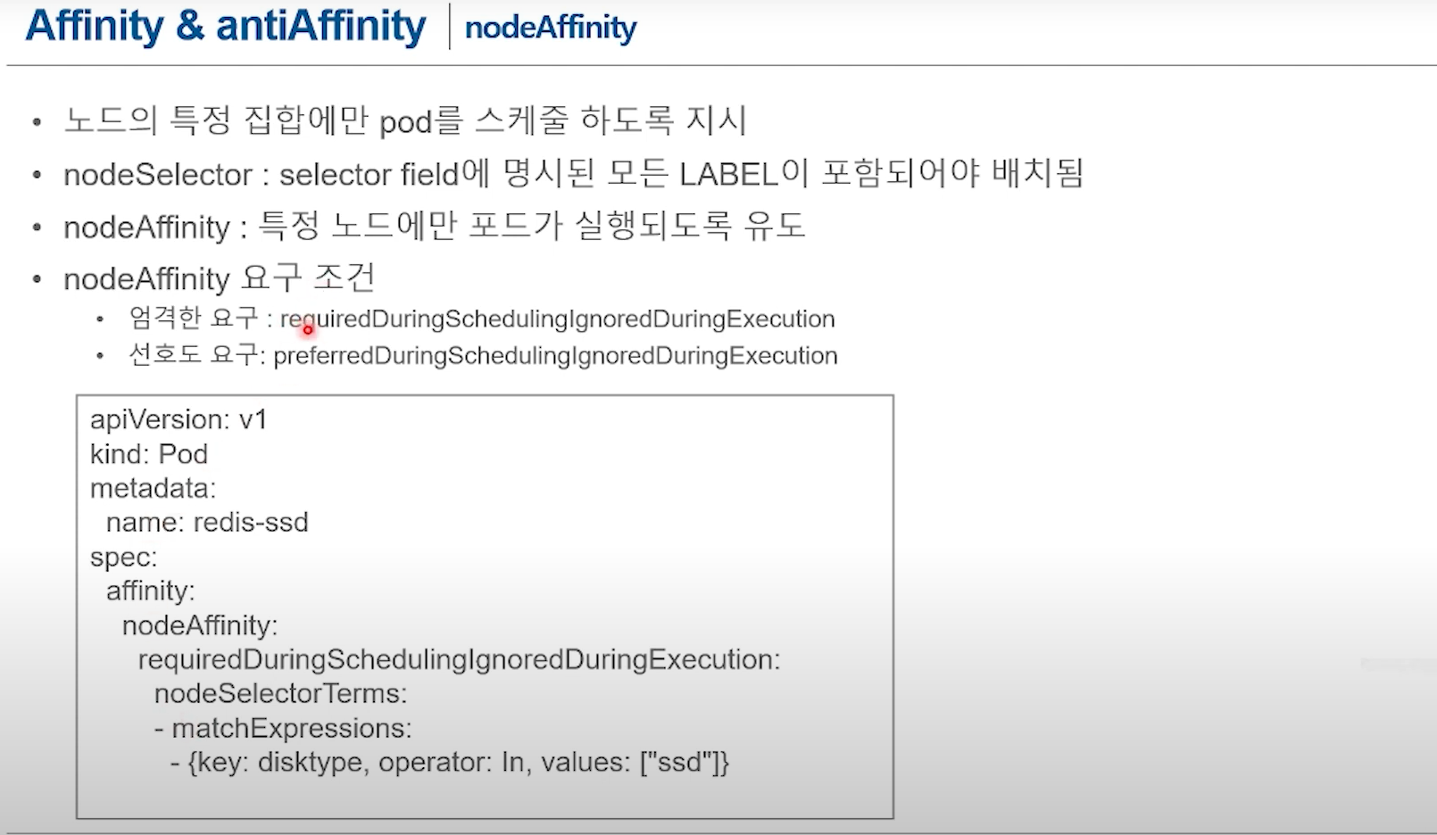 다른 점이 있다면 nodeAffinity에는 조건을 넣을 수 있다.