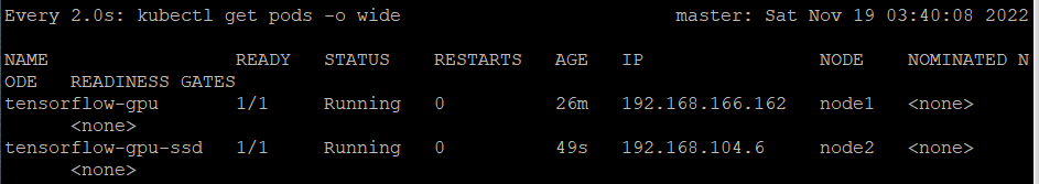 requireDuringSchedulingIgnoredDuringExecution는 통과하고 preferredDuringSchedulingIgnoredDuringExecution에서는 가중치가 10으로 kubectl apply -f tensorflow-gpu-ssd.yaml로 파드를 실행시키면 노드2에서 파드가 실행될 것이다.