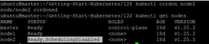 kubectl cordon node2 을 통해 노드2를 스케줄링 받지 않을 수 있다.